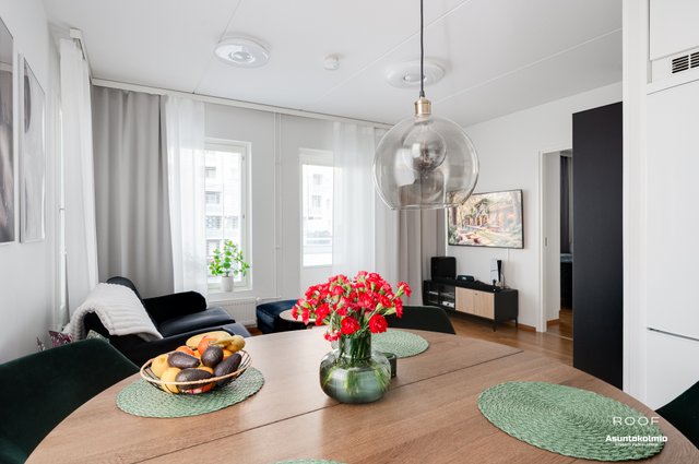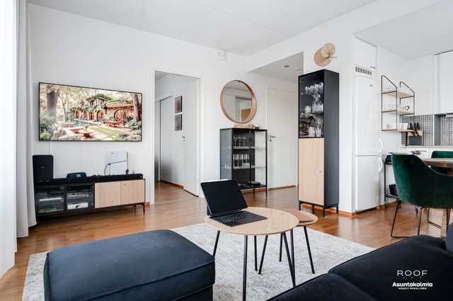 - Kiinteät kaapistot, kiinteät valaisimet, sälekaihtimet, tavanomainen tarpeisto. Irtaimisto neuvoteltavissa erikseen.