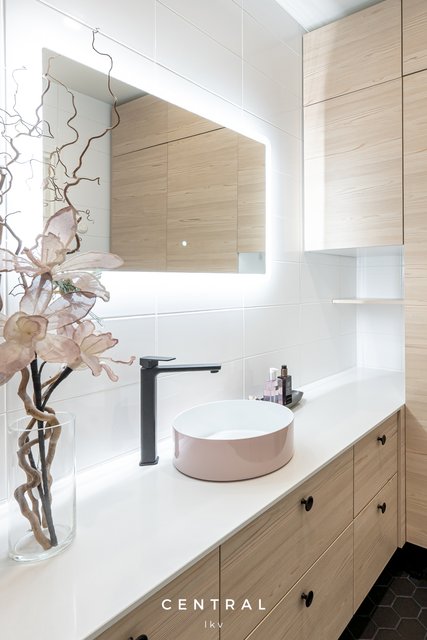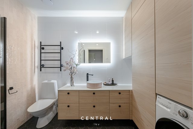 - Tilava kph/wc, sauna poistettu remontin yhteydessä, näin saatu hyvin säilytystilaa ja pesukone mahtuu hyvin kaappitilaan.