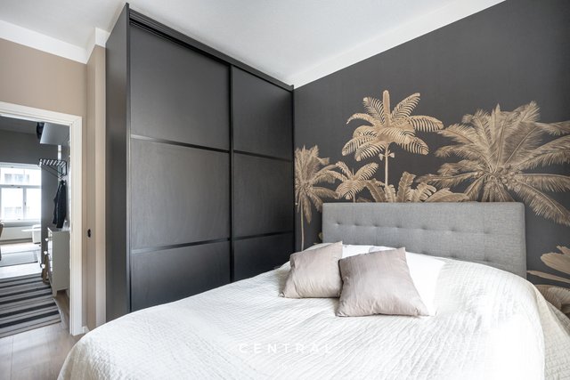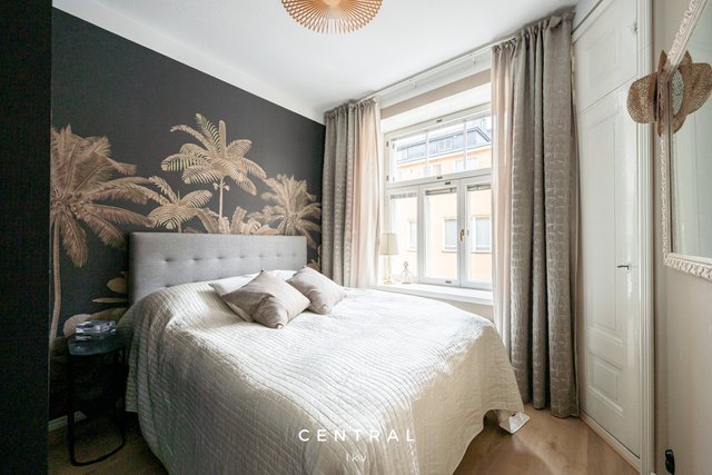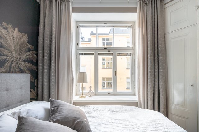 Makuuhuone sijaitsee rauhallisen sisäpihan puolella, ja tarjoaa runsaasti kaappitilaa. Tilava kylpyhuone on suunniteltu käytännöllisesti, ja sinne mahtuu myös pesukone, joka sisältyy kauppaan.