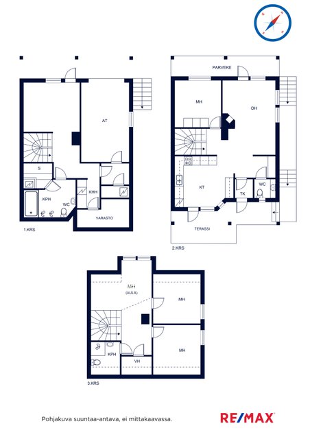 - Ylimmässä ja alimmassa kerroksessa on omat kylyhuoneet wc-kulhon kera Keskikerroksessa oma erillinen wc