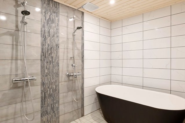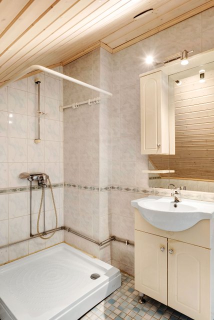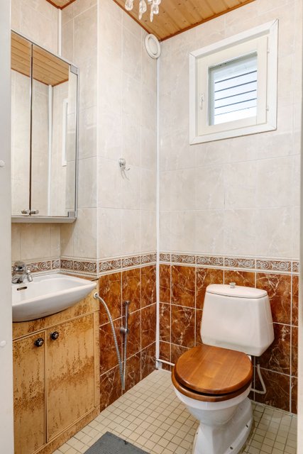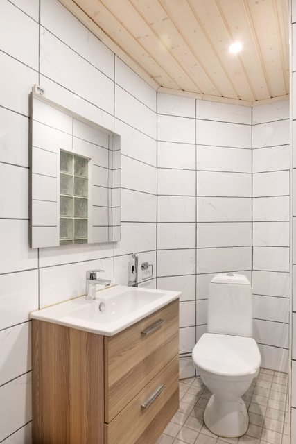 - WC-istuin, suihku, kylpyamme, lattialämmitys, allaskaappi, ja peili