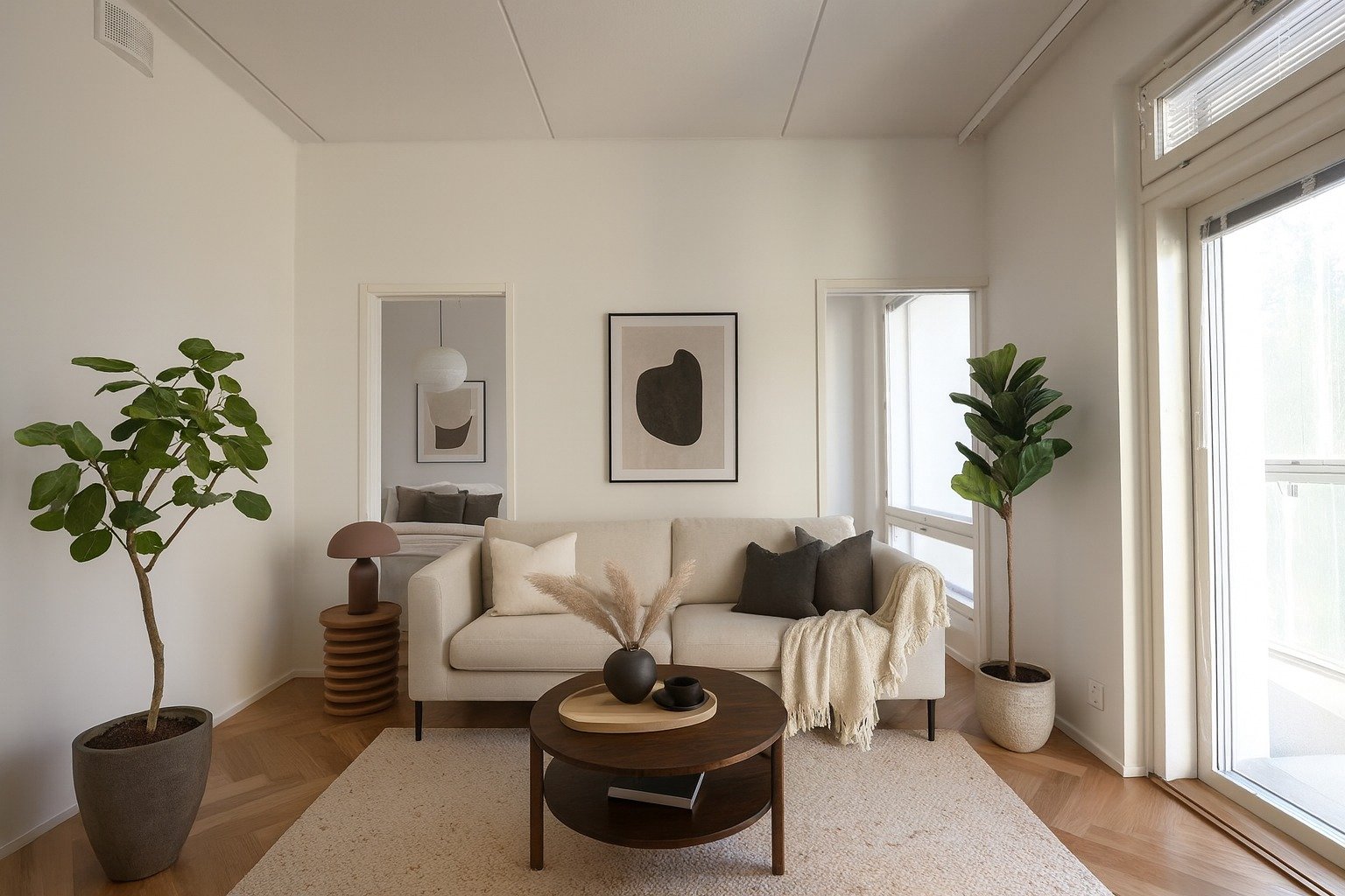 Olohuone ja avokeittiö muodostavat yhtenäisen ja avaran oleskelutilan. Makuuhuone on kompakti mutta toimiva, ja säilytystilaa löytyy hyvin. Tilava kylpyhuone vastaa nykyaikaisia vaatimuksia. Lasitettu parveke tuo lisätilaa asumiseen lähes ympäri vuoden.