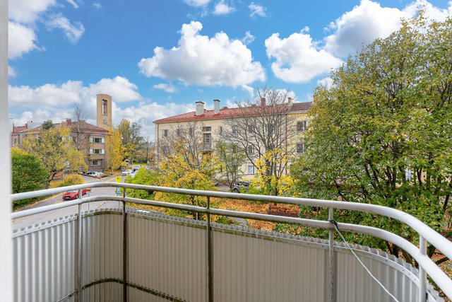 Tämä kaksio sijaitsee Meilahdessa, Mannerheimintien varrella, sisäänkäynti Valpurintien puolelta. Asunto on kolmannessa kerroksessa pihan puolella ja siitä on vehreät näkymät Pihlajatien suuntaan.