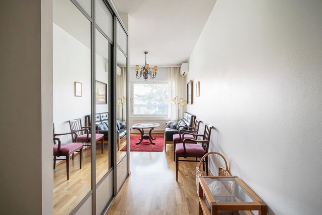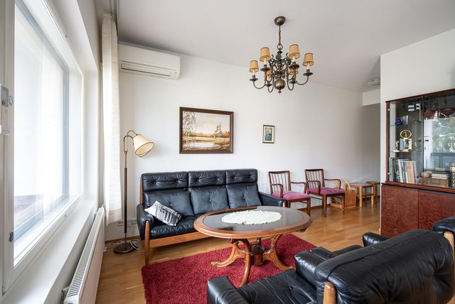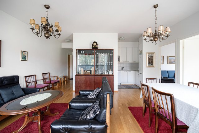 - Olohuone talon eteläpuolella, huoneesta korttelin sisäpiha näkymät. Olohuoneesta käynti lasitetulle parvekkeelle. Olohuoneen yhteydessä keittiötila.