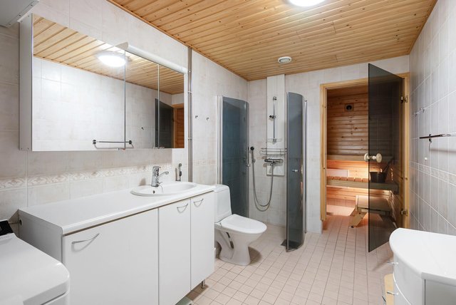 - WC-istuin, pesukoneliitäntä, lattialämmitys, suihku, peilikaappi, allaskaappi, pesuallas, ja suihkuseinä
