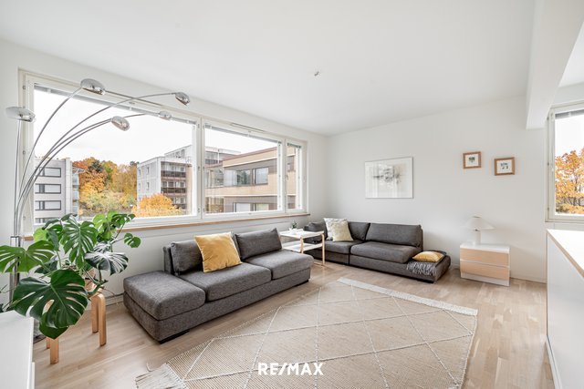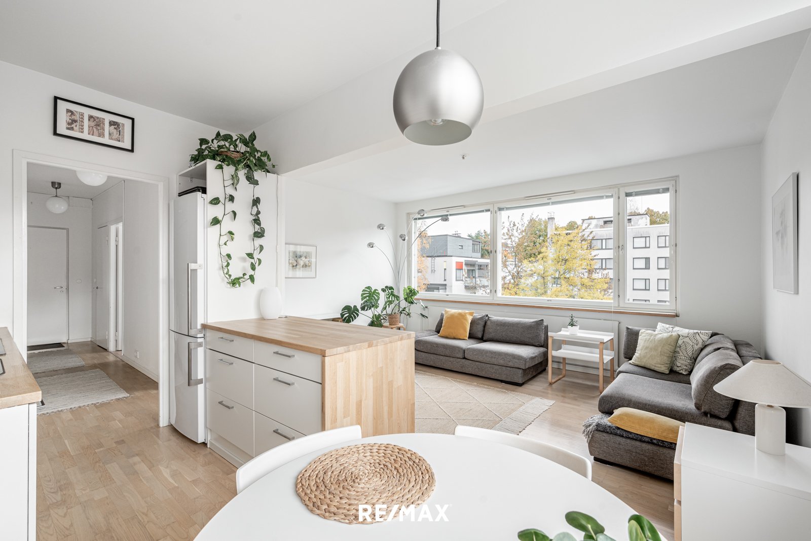 Tässä kolmannen kerroksen kulmahuoneistossa valo tulvii sisään useasta suunnasta ja luo tilan tuntua, joka yllättää jo ovesta astuttaessa. Fiksu ja selkeä pohjaratkaisu tekevät 52,5 neliöstä todella ison tuntuiset – avokeittiö sulautuu olohuoneeseen luontevasti, ja tilaa jää niin ruokailulle kuin oleskelullekin.