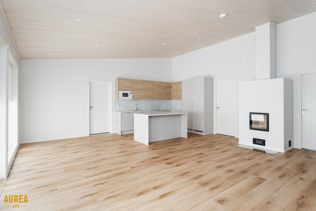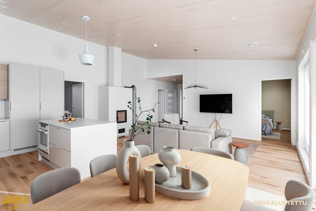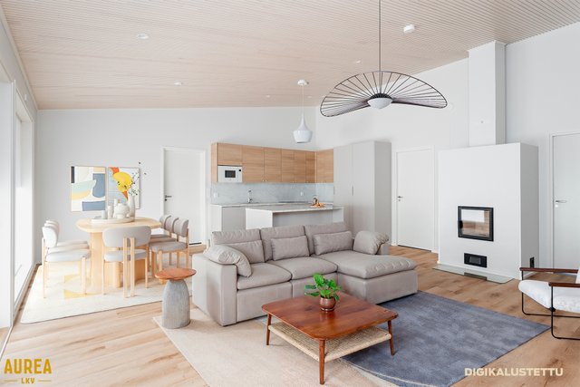 Yleisilmeeltään koti on vaalea, valoisa ja moderni, ja se on varustettu nykyaikaisin materiaalein. Oleskelutilojen isot ikkunat, viisto sisäkatto tyylikkäällä paneloinnilla sekä laadukkaat Topi-keittiön kalusteet integroiduilla kodinkoneilla luovat miellyttävän ja käytännöllisen arkiympäristön. Keittiössä on runsaasti kaapisto- ja tasotilaa sekä iso saareke, joka täydentää tilojen toimivuutta. Avarat ja valoisat oleskelutilat sekä varaava takka tekevät kodista viihtyisän.