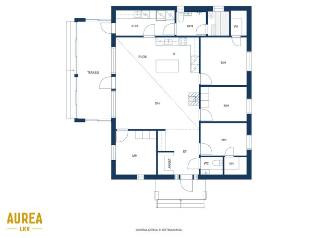 - Tilava ja valoisa olohuone, jossa korotettu viisto sisäkatto luo avaruutta ja viihtyisän tunnelman. Monipuolisesti kalustettavissa oleva tila saa kodin sydämen tuntua varaavasta takasta. Olohuoneesta on suora käynti takapihan oleskeluterassille, jonka voi halutessaan lasittaa.