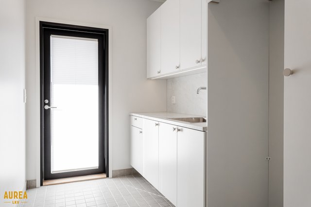 - Kodinhoitohuone on tilava ja käytännöllinen, suunniteltu arjen sujuvuutta varten. Runsaat säilytys- ja työskentelytilat tekevät pyykkihuollosta vaivatonta, ja suora kulku takapihan oleskeluterassille lisää arjen mukavuutta. Tilassa yhdistyvät toiminnallisuus, moderni ilme ja laadukkaat materiaalit.