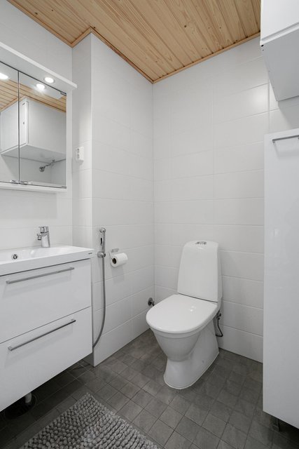 - Huoneistossa on kaksi wc:tä, yksi kummassakin kerroksessa. Sisäänkäyntikerroksen erillis-wc sijaitsee eteisen yhteydessä, sisäänkäynnin välittömässä läheisyydessä. Tila on kokonaan laatoitettu valkoisin seinä- ja trendikkään greigen värisin lattialaatoin. Wc:ssä on varusteina valolipallinen peilikaappi, käsienpesuallas, allaslaatikosto, allashana sekä bideesuihku. Wc:ssä on myös tilava varustekaappi sekä ilmanvaihtokone. Toinen wc sijaitsee alakerran kylpyhuoneessa. Lue lisää kylpyhuone-osiosta.