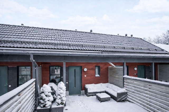 Huoneistoon sisäänkäynti tapahtuu omalta, aidatulta etupihalta, jonne on helppo jättää niin polkupyörät kuin suksetkin. Tai vielä paremmat säilytystilat niille löytyvät omasta etuopihan ulkovarastosta. Etupihalla on lisäksi pieni nurmialue sekä kivetty terassi.