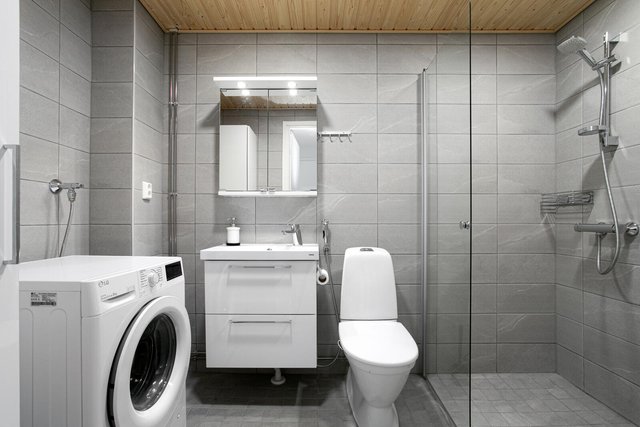 - Alakerran saunaosastolla sijaitseva kylpyhuone on onnistuneen tilava ja värimaailmaltaan lämmin greigensävyinen. Suihkutilan lisäksi kylpyhuoneesta löytyy niin wc-tilat kuin puitteet kodin vaatehuollollekin. Varusteina on suihku, wc-istuin, käsienpesuallas, allaslaatikosto, valolipallinen peilikaappi, bideesuihku, allashana, pesukoneliitäntä sekä varuste/pyykkikaappi. Tilaa on myös pesutornille. Kylpyhuoneen seinät ja lattia ovat laatoitetut.