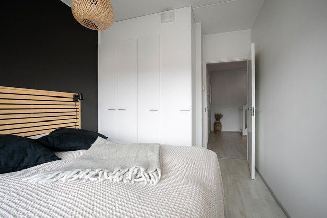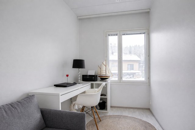 - Huoneiston kaksi makuuhuonetta sijaitsevat alakerran rauhassa. Molemmat huoneet ovat hyvän kokoisia, päämakuuhuone tosin hieman suurempi. Molemmissa huoneissa on pohjakuvanmukaiset vaatekaapistot ja lisää säilytystilaa on tarjolla alakerran aulan vaatehuoneesta. Makuuhuoneiden seinät ovat maalatut ja lattia on helppohoitoista laminaattia. Päämakuuhuoneesta on käynti vilpolaksikin kutsutulle omalle terassialueelle.