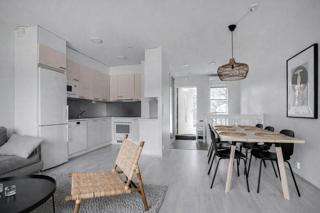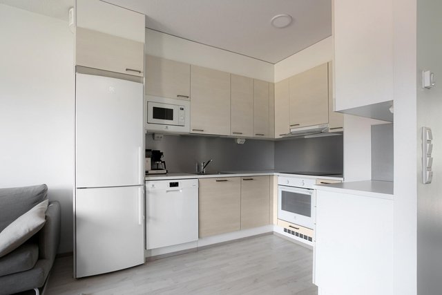 - Hurmaava vaaleasävyinen avokeittiö, jonka siistin ja yksinkertaisen ulkoasun taakse kätkeytyy täysin varusteltu ja erittäin toiminnallinen keittiökokonaisuus koko perheen tarpeisiin. Keittiö avautuu osaksi avaraa oleskelualuetta, johon valkoiset tyylikkäät kodinkoneet, valkoiset massiiviset työtasot, lämpimän vaaleat kaapistot sekä laadukkaat kattoledit sopivat loistavasti. Ruokapöydälle on oleskelualueella useita mahdollisuuksia pienestä aamiaispöydästä aina suurenkin seurueen illallispöytään saakka. Suurien illalliskutsujen kokki voi myös halutessaan helposti täydentää keittiötä saarekkeella tai niemekkeellä. Varusteina keittiössä on: jääpakastinkaappi, astianpesukone, kalusteuuni, liesitaso sekä liesituuletin. Keittiön välitilassa on välitilalevy, muuten seinät ovat maalatut. Lattiassa on helppohoitoista laminaattia.