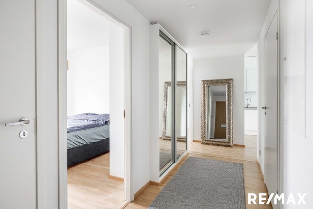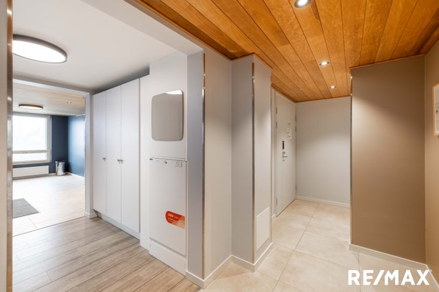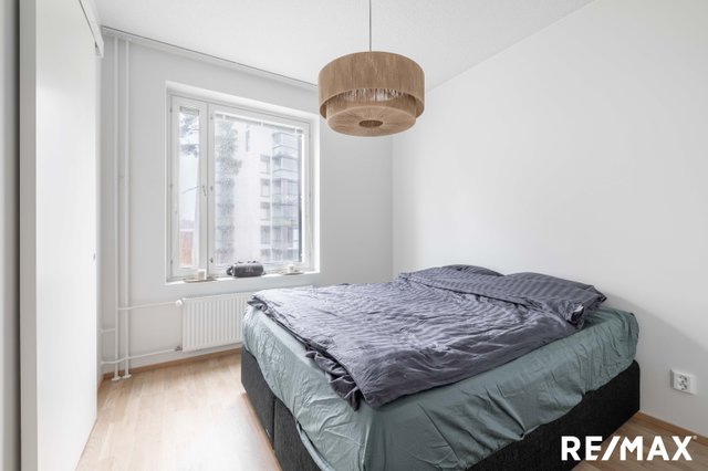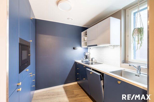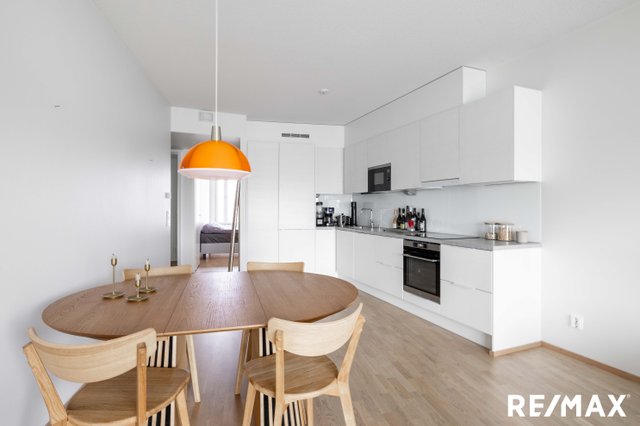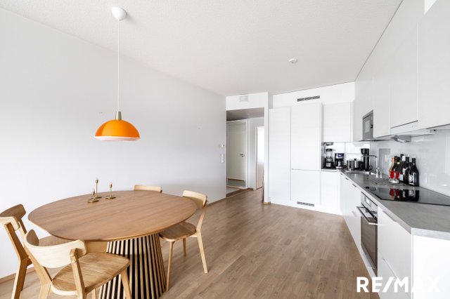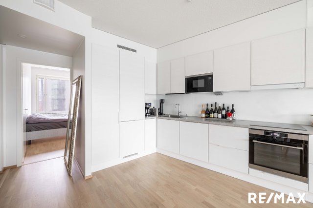Asunnon sydän on avara avokeittiö, joka sulautuu saumattomasti olohuonetilaan luoden viihtyisän ja yhtenäisen kokonaisuuden. Keittiö on varusteltu laadukkailla kodinkoneilla, jotka tekevät arjen ruoanlaitosta helppoa ja nautinnollista. Kaksi tilavaa makuuhuonetta tarjoavat runsaasti säilytystilaa – toisessa on vaatekaapisto ja toisessa käytännöllinen liukuovellinen vaatehuone.