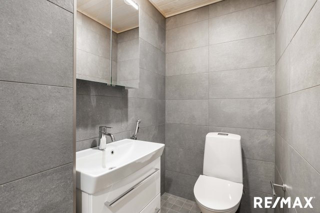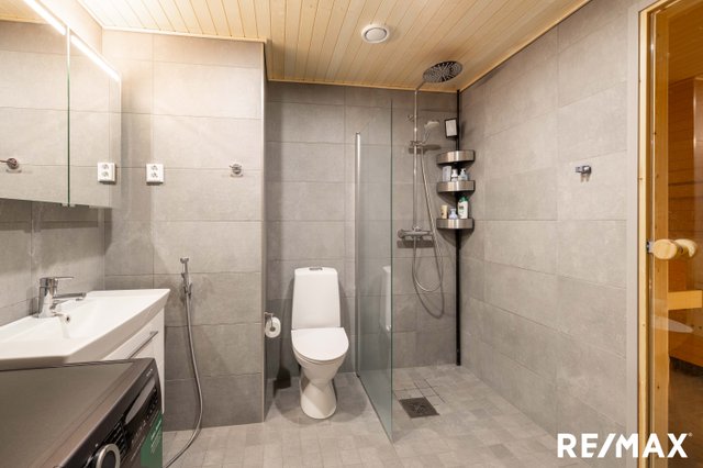 Tyylikkäässä ja modernissa kylpyhuoneessa on kaikki, mitä toimivaan arkeen tarvitaan, ja oman saunan ansiosta rentoudut kotona juuri silloin kun haluat. Erillinen WC lisää asumismukavuutta.