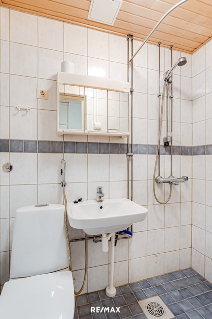 - WC-istuin, suihku, pesukoneliitäntä, bidee-suihku, peilikaappi, ja pesuallas