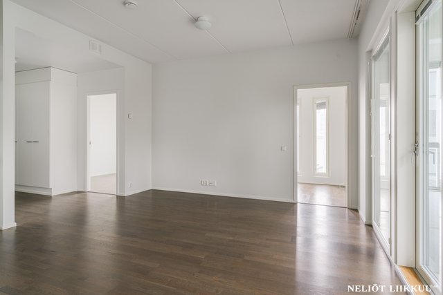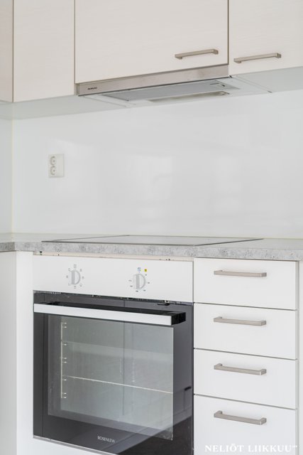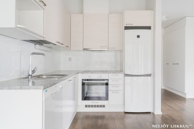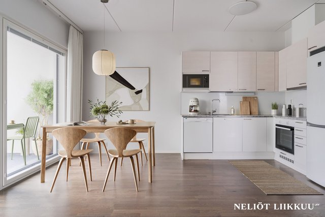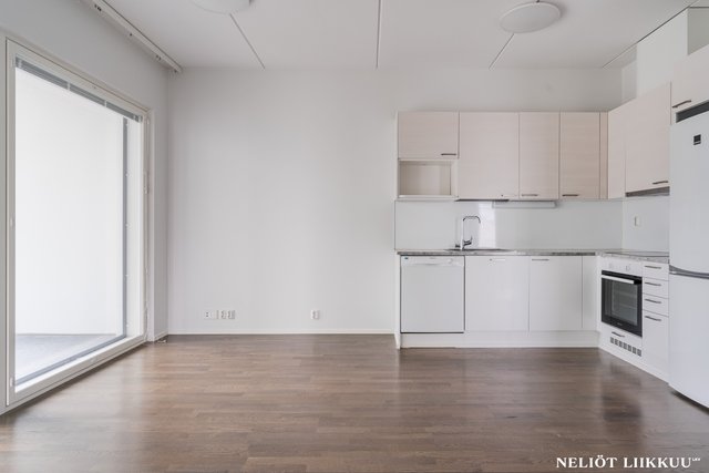 Asunnon avokeittiö yhdistyy tilavaan olohuoneeseen, mikä luo avaran ja toimivan kokonaisuuden ja isot ikkunat tuovat valoa ja avaruutta koko asuntoon. Keittiön vaaleat kaapistot ja modernit kodinkoneet tekevät ruoanlaitosta miellyttävää.