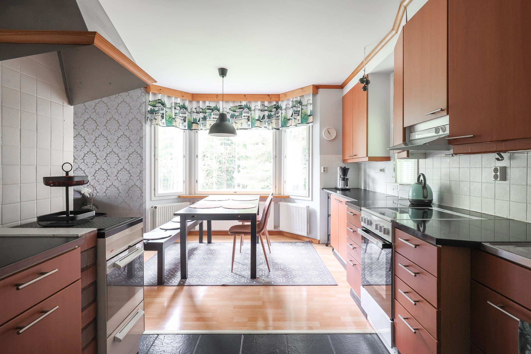 - Kiintokalusteet. Välitilaseinä: laatta. Työtasot: laminaatti. Kodinkoneet: astianpesukone, jääkaappi, vapaasti seisova sähköliesi, liesituuletin (huippuimuri). Lattia: laatta. Ruokailutilan lattia: laminaatti. Keittiön kaminan pelti ei aukea kunnolla.