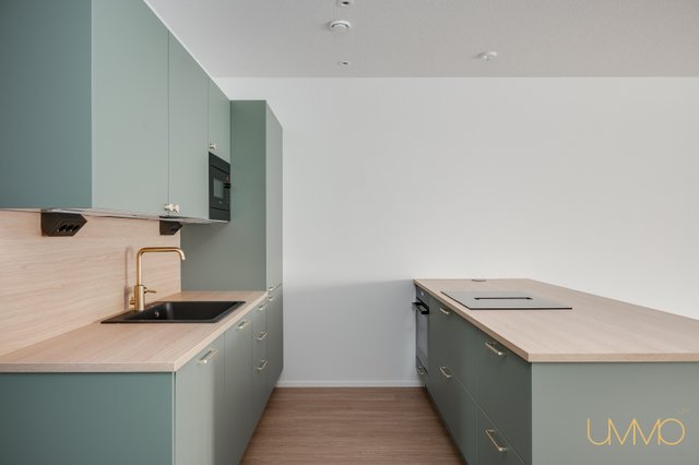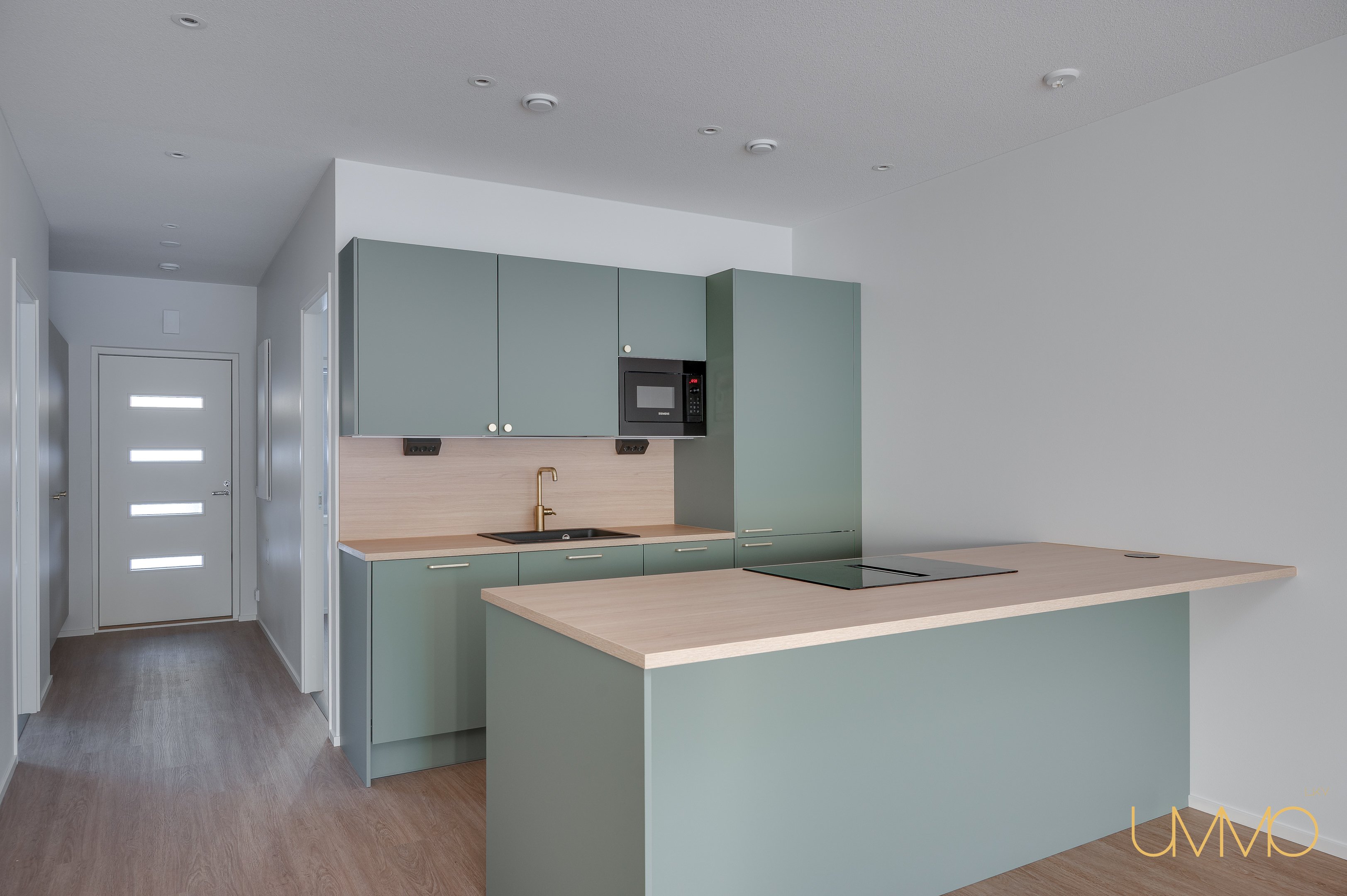 - Lattia: Vinyylilankku, jalkalistat valkoinen tehdasmaalattu Seinät: Tasoitettu, maalaus taitettu valkoinen Katto: Ruiskutasoite Kalusteet: Työtasot laminaattia, allas upotettu yksialtainen rst- tai komposiittiallas. Välitilalevy laminaattilevy. Koneet: Kalustepiirustusten mukaan integroitu jää-/pakastinkaappi, induktioliesi imevällä liesituulettimella (aktiivihiilimalli), kalusteuuni, integroitu mikro, kalustepeitteinen astianpesukone