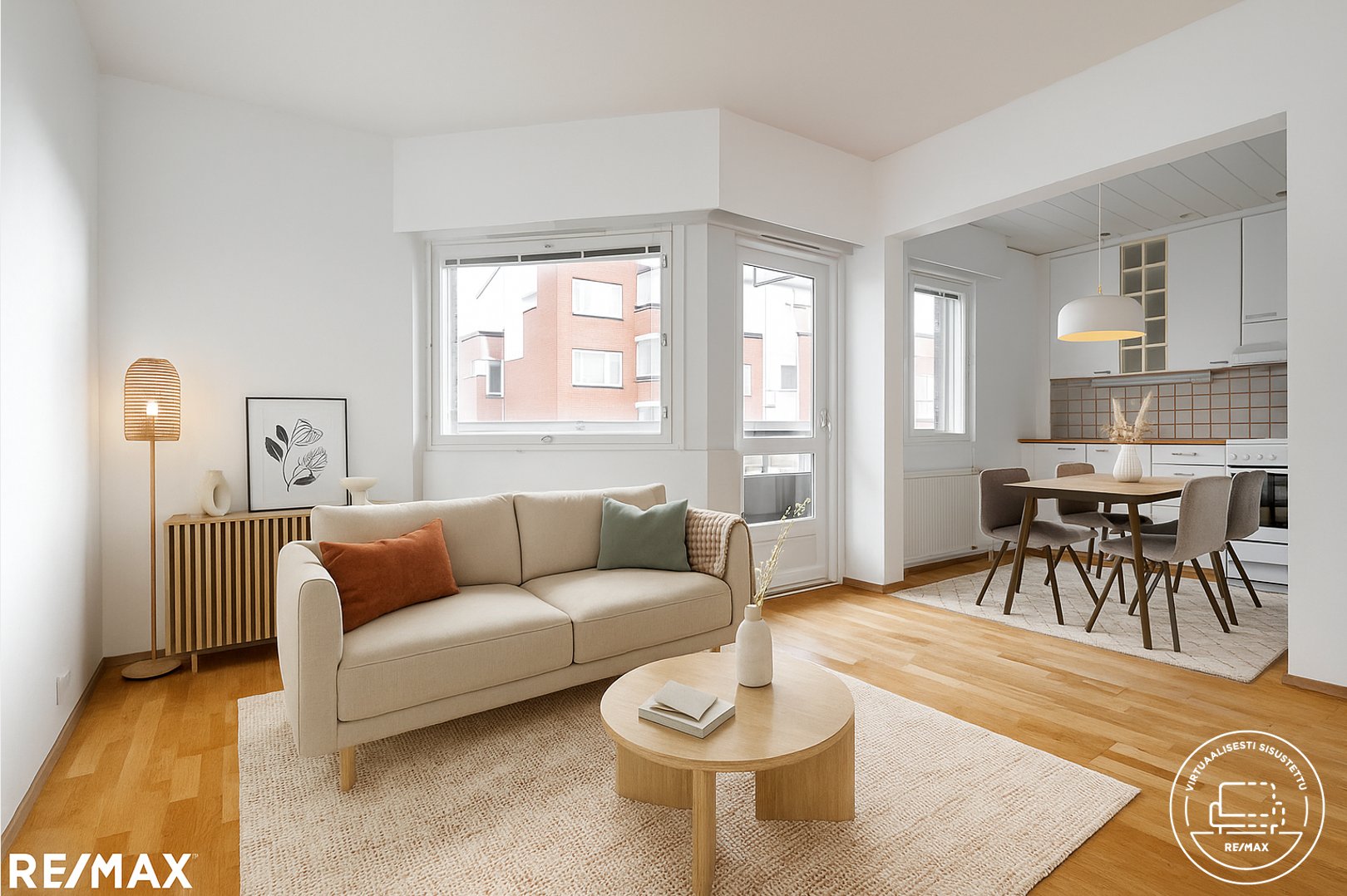 Valoisa olohuone jatkuu lasitetulle parvekkeelle, joka toimii kodin lisähuoneena ympäri vuoden – täydellinen paikka aloittaa aamu kahvikupin äärellä tai rentoutua illalla kaupungin rauhoittuessa.