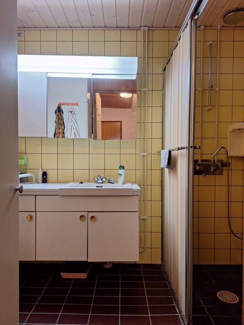 - Suihkuseinä, peilikaappi, suihku, pesuallas, ja allaskaappi