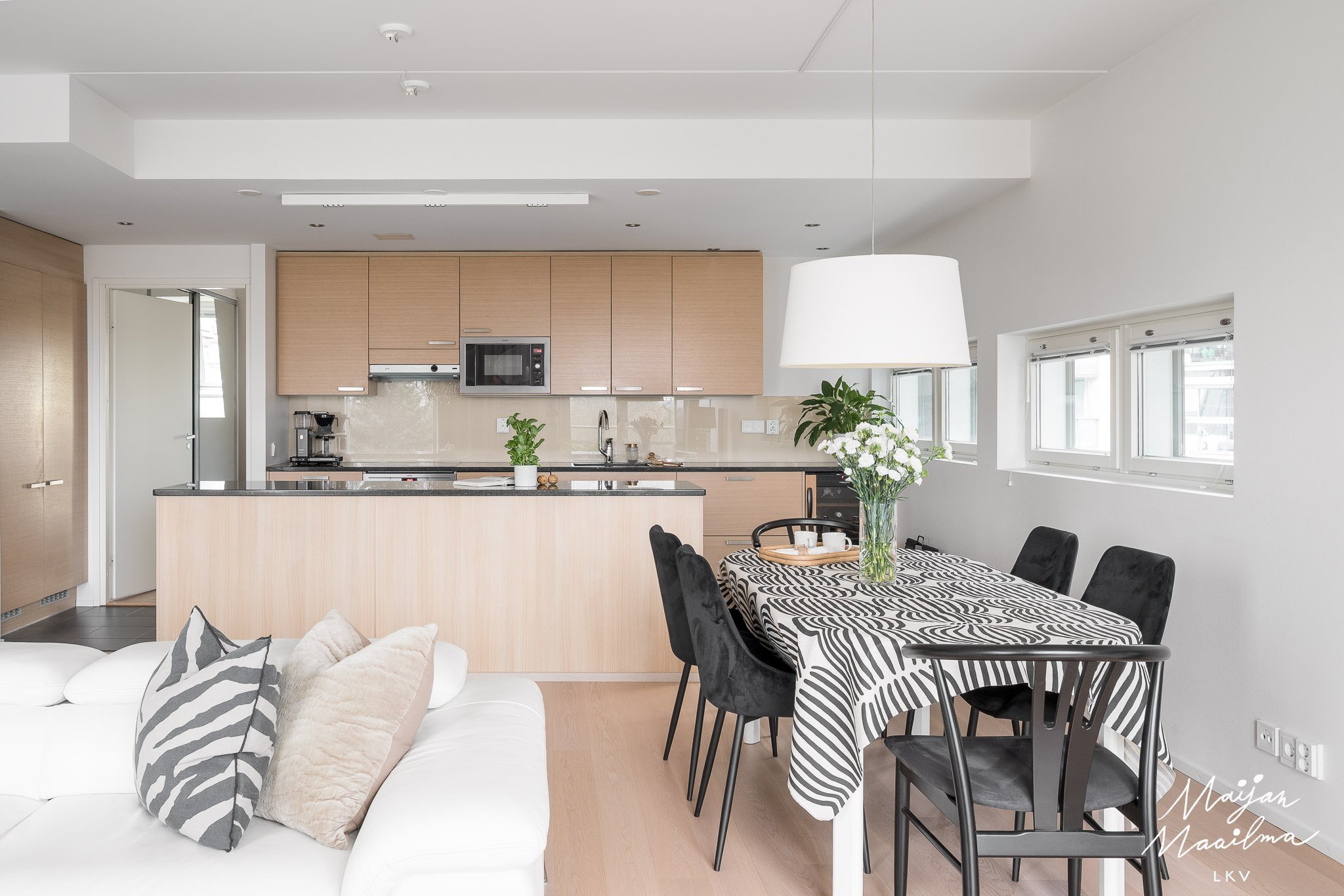 Tarjolla upea viidennen kerroksen huoneisto Kampissa. Asunnon keskiön luo olohuoneen, ruokailutilan ja keittiön muodostama avara kokonaisuus. Keittiön Puustellin kaapistot ovat ajattomat ja kodinkoneet laadukkaat. Tummat kivitasot ovat tyylikkäät. Lasku- ja kaappitilaa on runsaasti. Asunnon kylpyhuone on avara, tilaa on myös pyykkihuollolle. Sauna lisää viihtyisyyttä. Asunnossa on kaksi makuuhuonetta, toisesta on käynti itään suuntaavalle lasitetulle parvekkeelle, jossa on mukavasti tilaa ajanvietolle. Parvekemaisemat ovat avaralle sisäpihalle ja olohuoneen yhteydessä olevan ranskalaisen parvekkeen näkymät avautuvat Hietaniemen suuntaan. Asunto on valoisa viidennen kerroksen ja suurien ikkunoidensa ansiosta. Lisämukavuutta antaa huoneistokohtainen ilmastointi ja mukavuusviilennysjärjestelmä. Arkea puolestaan helpottaa erillinen wc ja runsaat säilytystilat.