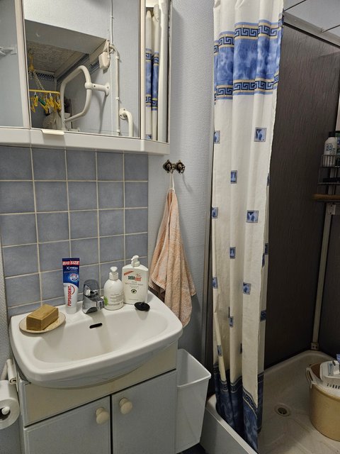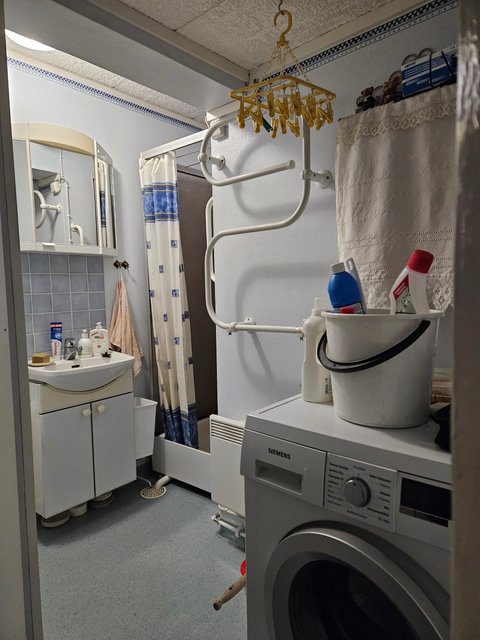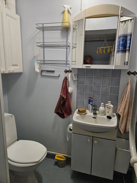 - Suihku, wc-istuin, pesukoneliitäntä, allaskaappi, peilikaappi, pesuallas, pyyhekuivain, ja suihkukaappi