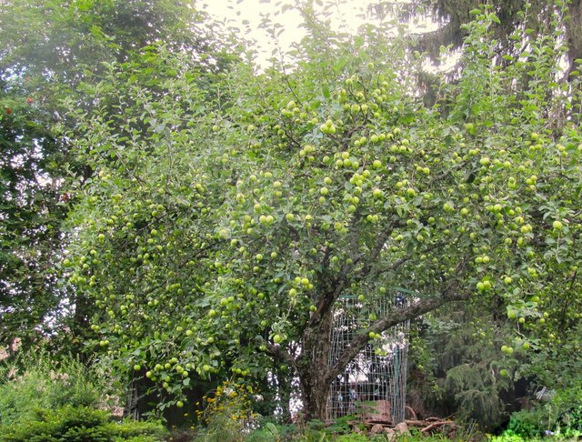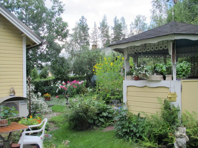 - Vehreällä pihalla paljon erilaisia istutuksia, perennoja, marjapensaita ja hedelmäpuita.