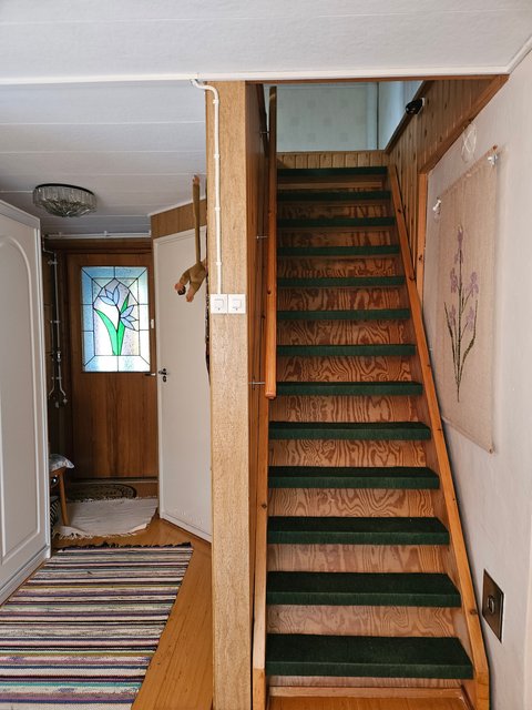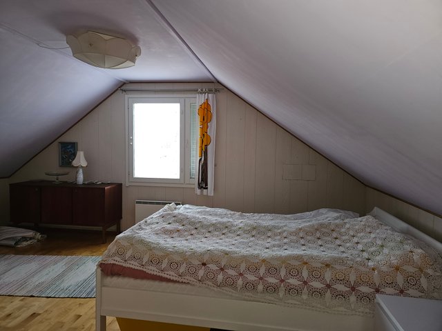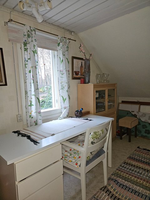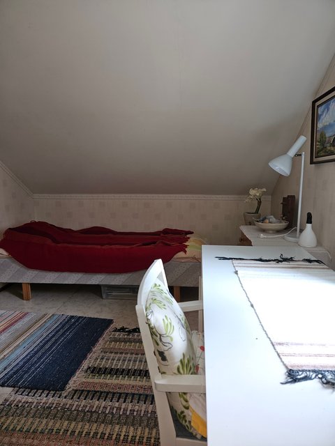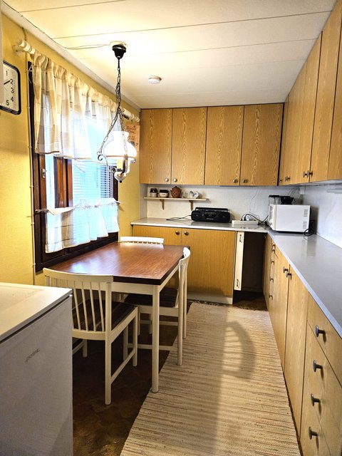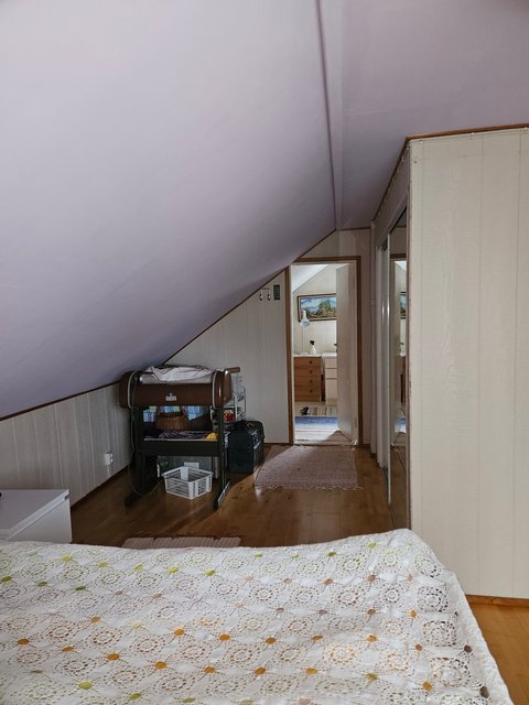 Alakerrassa keittiö, olohuone ja pienempi huone vaikka työhuoneeksi sekä pesuhuone/wc, yläkerrassa (jyrkät portaat) kaksi makuuhuonetta ja tilava vaatehuone.