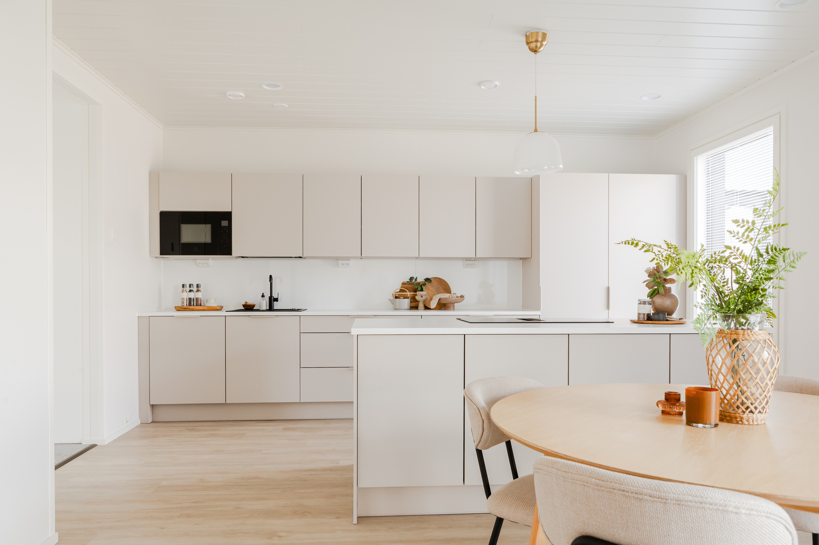Tässä kiinteistössä huomio kiinnittyy pohjaratkaisun toimivuuteen sekä laadukkaaseen yleisilmeeseen jokaista yksityiskohtaa myöten. Talon alakerrassa on valoisa ja avara olohuone, johon Puustellin saarekekeittiö hienosti yhdistyy. Talon alakerrassa on myös erillinen wc sekä yksi makuuhuone, joka lisää pohjaratkaisun käytännöllisyyttä. Yläkerrassa on kolme makuuhuonetta, vaatehuone sekä tyylikäs saunaosasto ja kodinhoitohuone. Yläkerrassa on toki myös erillinen wc. Materiaalit ovat kauttaaltaan tyylikkäitä ja moderneja.