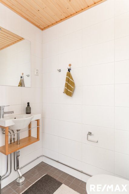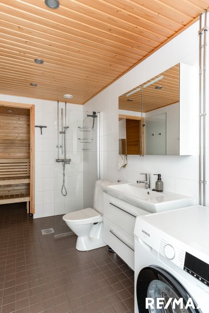 - WC-istuin, suihkuseinä, pesukoneliitäntä, lattialämmitys, peilikaappi, pesuallas, allaskaappi, bidee-suihku, ja rättipatteri, sähkökäyttöinen