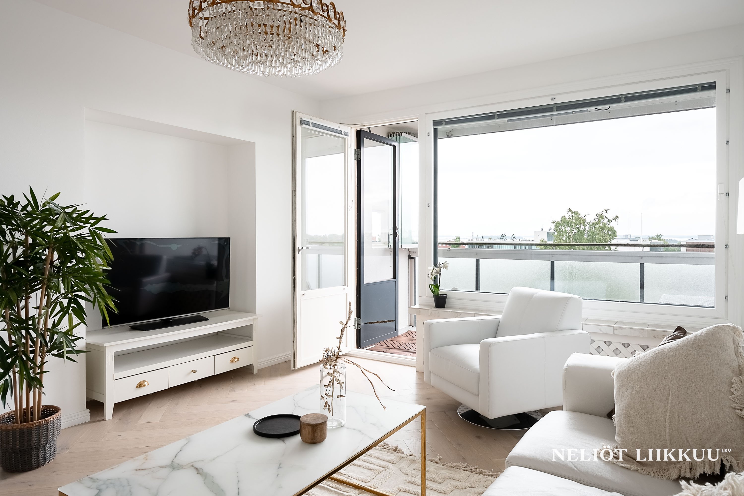 - Valoisa olohuone keittotilan yhteydessä tarjoaa rauhoittavat ja kauaskantoiset näkymät länteen. Ilmalämpöpumppu (Electrolux, 2021) takaa miellyttävän huonelämpötilan myös kesähelteillä. Käynti tilavalle lasitetulle parvekkeelle (länsi). Koristeristikot pattereiden päällä. Seinät ja katto maalattu, lattiassa valkolakattu tammiparketti.
