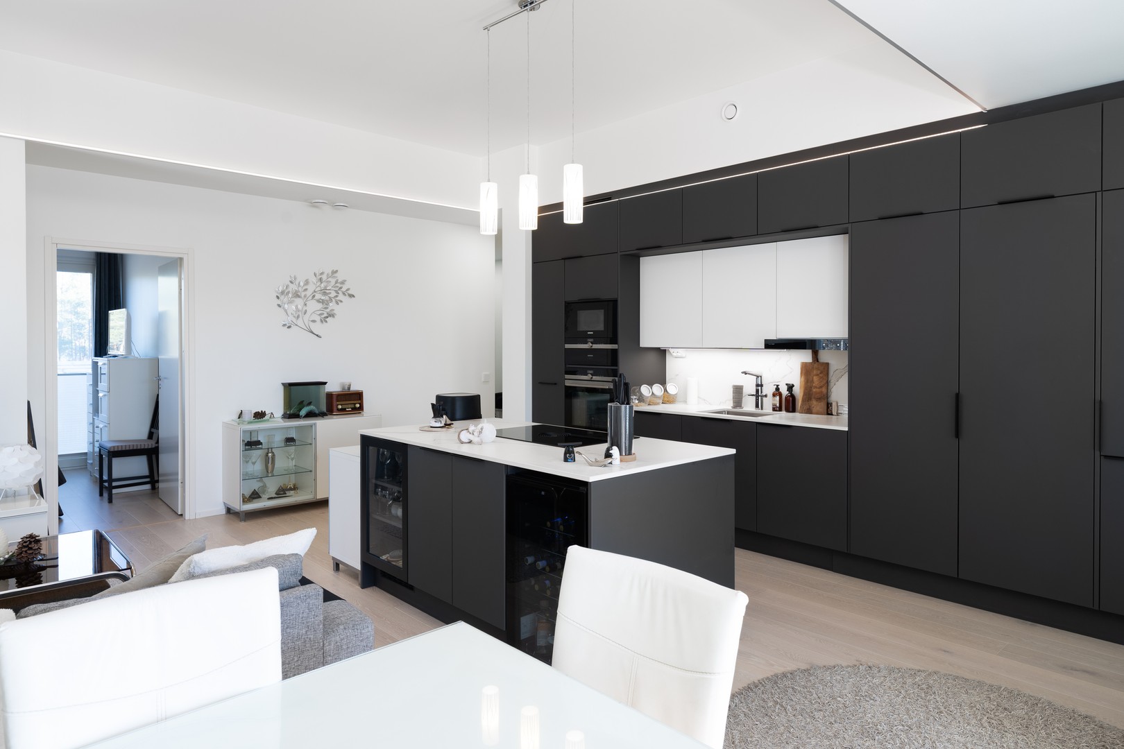 - Avokeittiön saarake mahdollistaa seurustelun olohuoneen vieraiden kanssa kokkauksen yhteydessä. Saarekkeen induktioliesi on varustettu omalla imevällä tuulettimella. Aamiaiskaappi on mahtava lisä ja pitää keittiön helposti siistinä. Reilu 3 m huonekorkeus lisää avaruuden tunnetta. Keittiön laadukkaat koneet takaavat hyvän lopputuloksen ja lämpölaatikossa voit pitää ruuat lämpinä myöhästyville. Huonekorkeutta on hyödynnetty myös lisäämällä keittiöön yläkaappeja, joille on aina tarvetta. Apteekkarinkaappi helpottaa tuotteiden löytymistä ja tupla jääkaappi/pakastin yhdistelmät varmistavat sen että päivittäin ei ole pakko käydä kaupassa. Saarekkeen yhteydessä on myös useita kaappeja astitoita varten ja yhdessä lasiovi. Viinikaappi kruunaa tämän yhdistelmän. Välitila ja kaikki keittiötasot ovat tyylikästä kiveä, jotka kestävät myös lämpimien astioiden laskemisen. Keittiön hana on varustettu kosketusvapaalla toiminnalla.