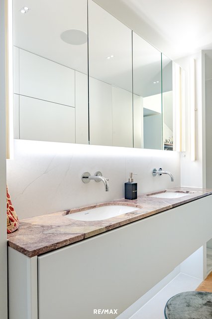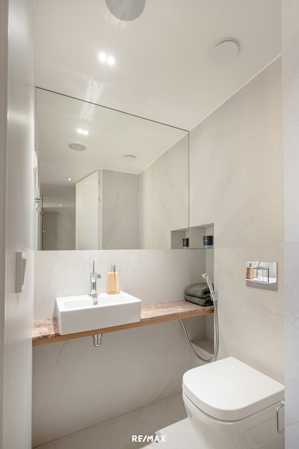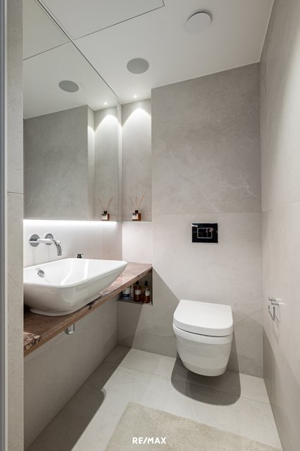 - Asunnossa on kolme WC:tä. Seinäkiinnitteiset wc-istuimet, peilikaapit, marmoritasot, lavuaari, hana, peilikaapit ja peilit, bidesuihku. LATTIAT: Laatta. SEINÄT: Laatta