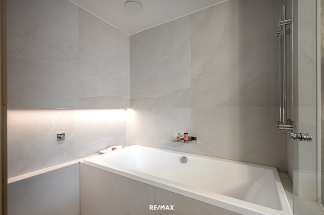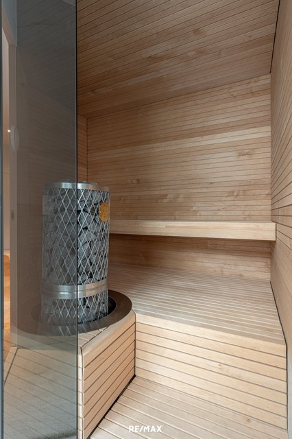 Asunnossa on myös oma sauna, jossa on IKI pilarikiuas, sekä tyylikäs kylpyhuone.