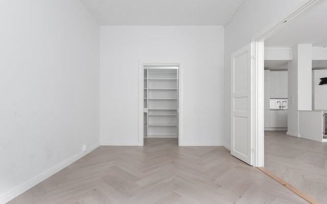 - Toisen makuuhuoneen yhteydessä on vaatehuone, joka on varustettu hyllyjärjestelmällä, joka ulottuu lattiasta kattoon ja tarjoaa runsaasti säilytystilaa vaatteille, asusteille ja muille tavaroille.