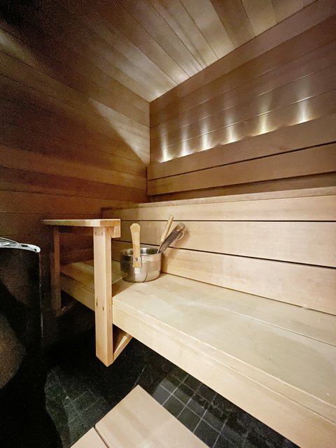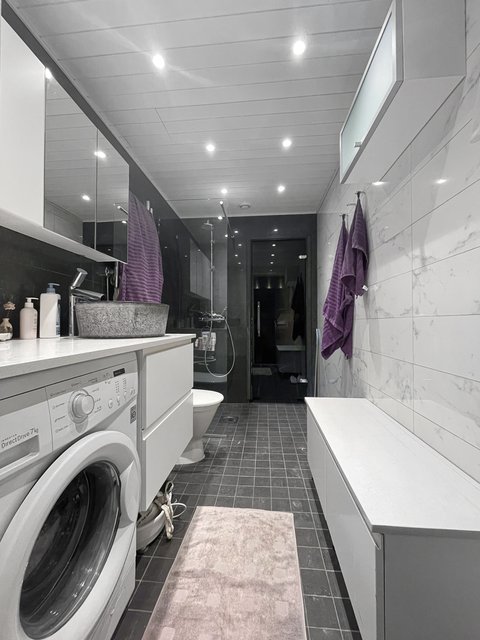 - Suihku, wc-istuin, suihkuseinä, pesukoneliitäntä, lattialämmitys, allaskaappi, pesuallas, bidee-suihku, ja vesikiertoinen pyyhekuivain