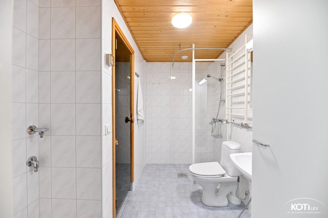 - WC-istuin, suihku, pesukoneliitäntä, peilikaappi, pesuallas, lattialämmitys, suihkuseinä, rättipatteri, ja bidee-suihku