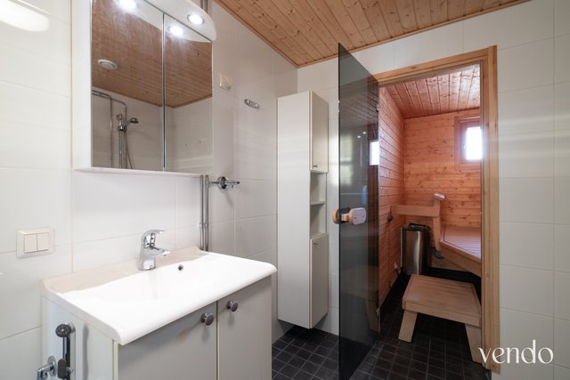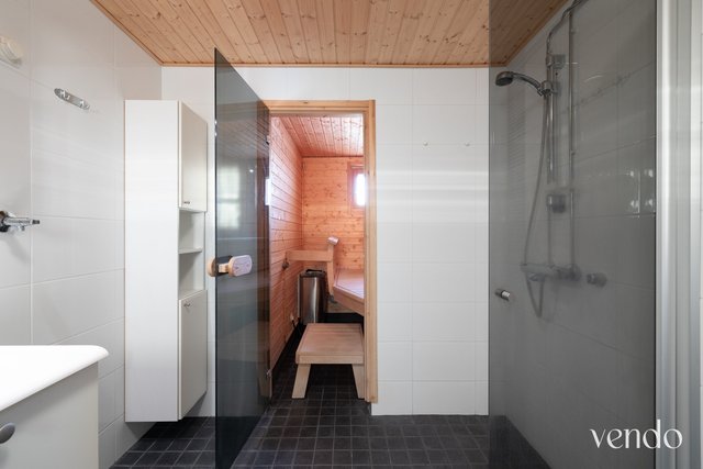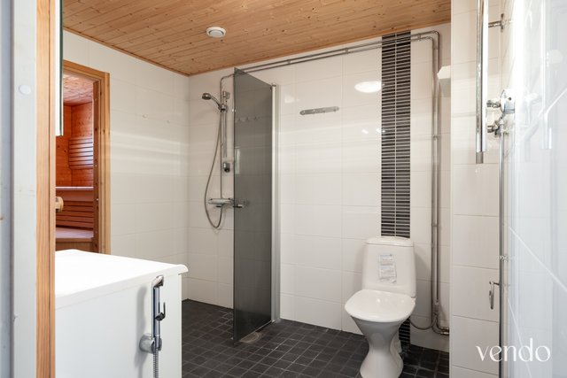 - WC-istuin, suihku, suihkuseinä, pesuallas, allaskaappi, bidee-suihku, pesukoneliitäntä, peilikaappi, ja lattialämmitys