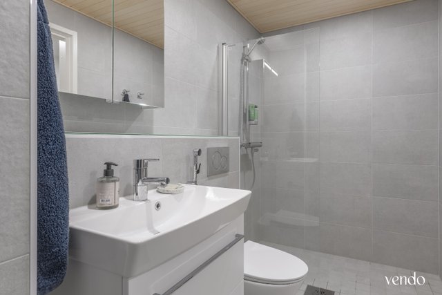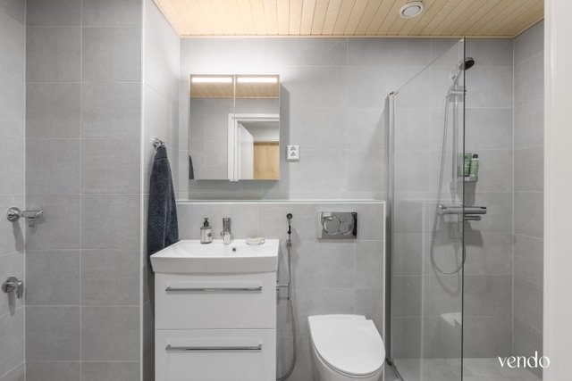 - WC-istuin, pesukoneliitäntä, suihkuseinä, suihku, peilikaappi, lattialämmitys, bidee-suihku, allaskaappi, ja pesuallas