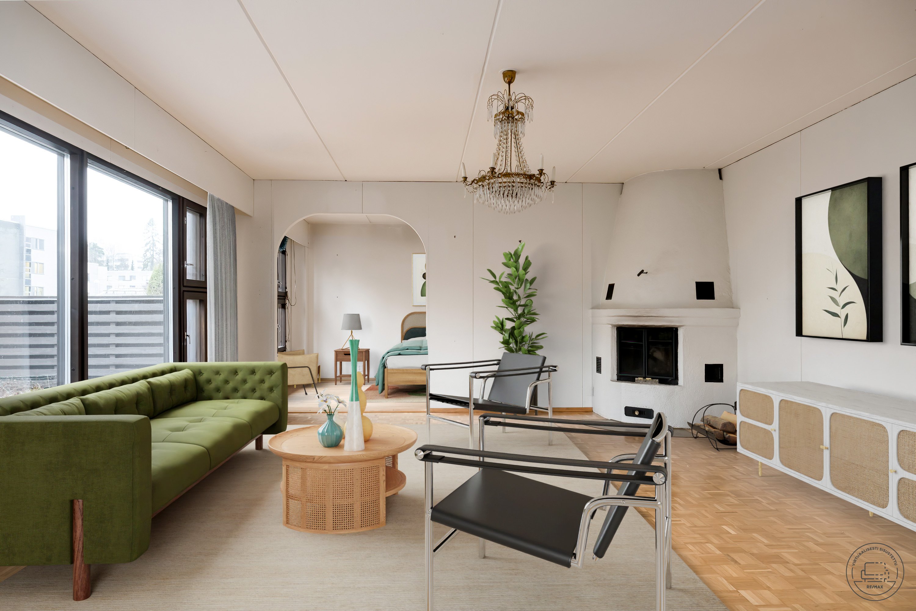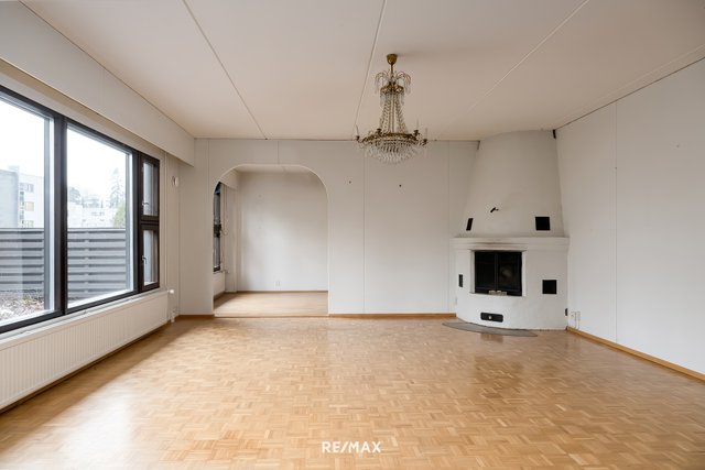 - Valoisa ja avara olohuone, jossa kaunis paikalla muurattu takka ja käynti asunnon aurinkoiselle terassille sekä aidatulle pihalle.