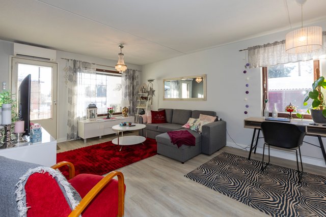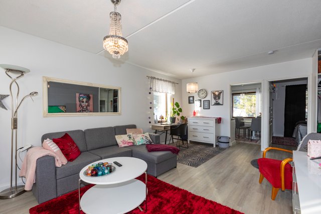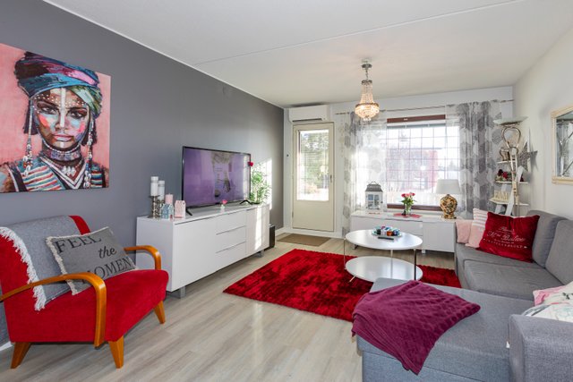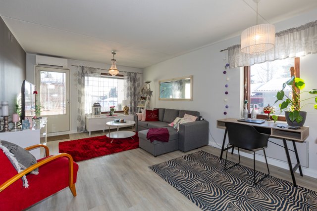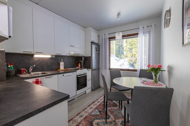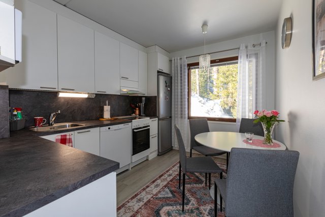 This bright apartment in a terraced low-rise building is located in the peaceful Syväsenvaara area of Rovaniemi, close to beautiful forest surroundings. As an end unit with windows facing three directions, the apartment enjoys an abundance of natural light throughout the day.