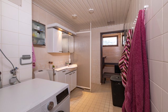 - Pesukoneliitäntä, lattialämmitys, wc-istuin, suihku, peili, ja kylpyhuonekaapisto