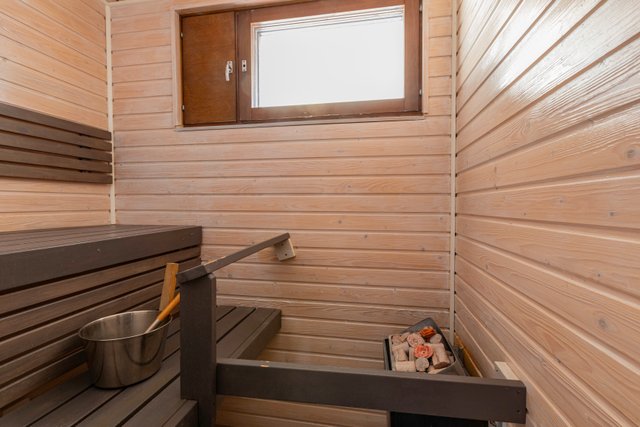 The bathroom features underfloor heating, and the private sauna provides relaxing moments after a long day. The kitchen is equipped with modern appliances, including a dishwasher and a ceramic cooktop. A covered parking space with an electrical outlet is also included.