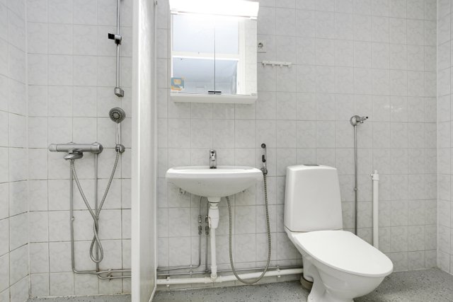 - WC-istuin, suihku, peilikaappi, pesuallas, suihkuseinä, ja pesukoneliitäntä