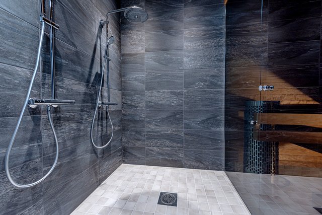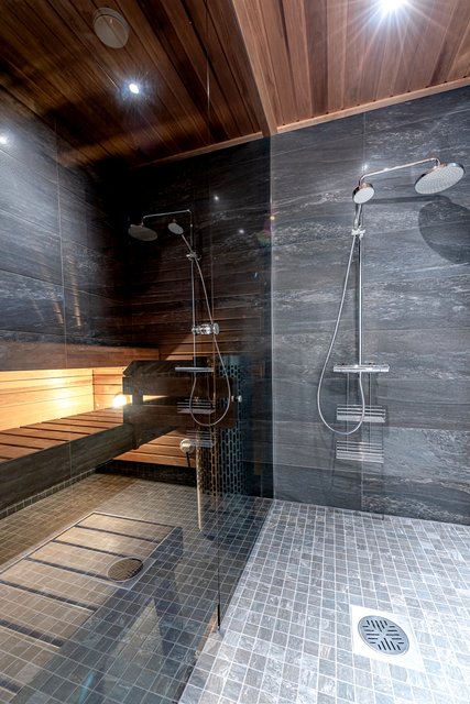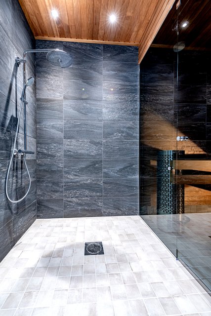 - Lattialämmitys, wc-istuin, suihku, allaskaappi, peilikaappi, ja kiinteät valaisimet