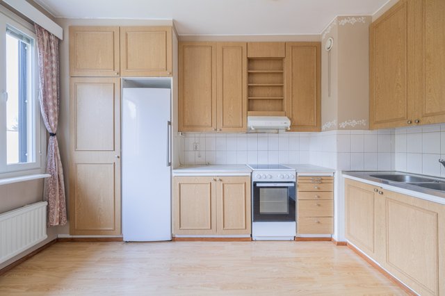 Keittiössä on kaikki tarpeellinen arjen sujuvuuteen. Kylpyhuone on käytännöllinen, ja sieltä löytyy liitäntä pesukoneelle. Asunnossa on valoisa olohuone ja kaksi tilavaa makuuhuonetta, joista toisessa on kaapisto. Lisäksi on vaatehuone.