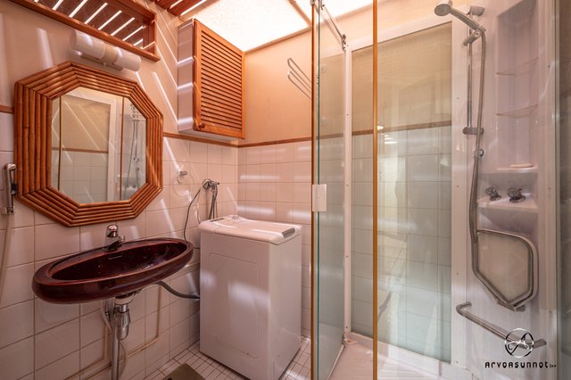 - Suihku, suihkuseinä, pesukoneliitäntä, peili, pesuallas, ja bidee-suihku