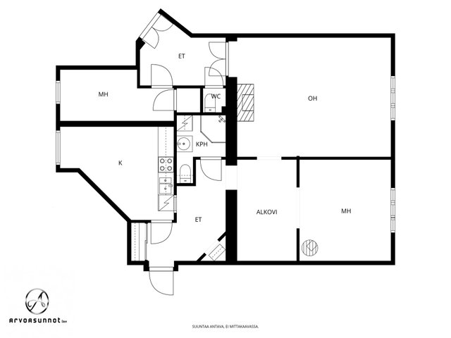 - Ei tarkistusmitattu. Pinta-alat saattavat tämän ikäisissä kohteissa (yhtiö rekisteröity ennen 01.01.1992) poiketa olennaisestikin asuinrakennusten nykyisten mittaustapojen ja standardien (SFS 5139) mukaan laskettavasta asuintilojen pinta-alasta. Pinta-ala voi siis olla edellä mainittua pienempi tai suurempi.